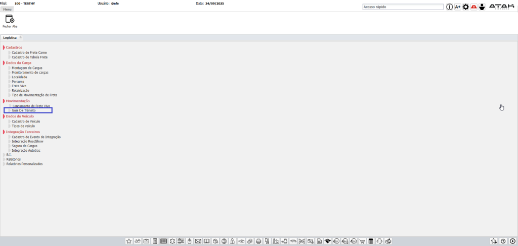 Menu: Logística > Movimentação > Guia de Trânsito