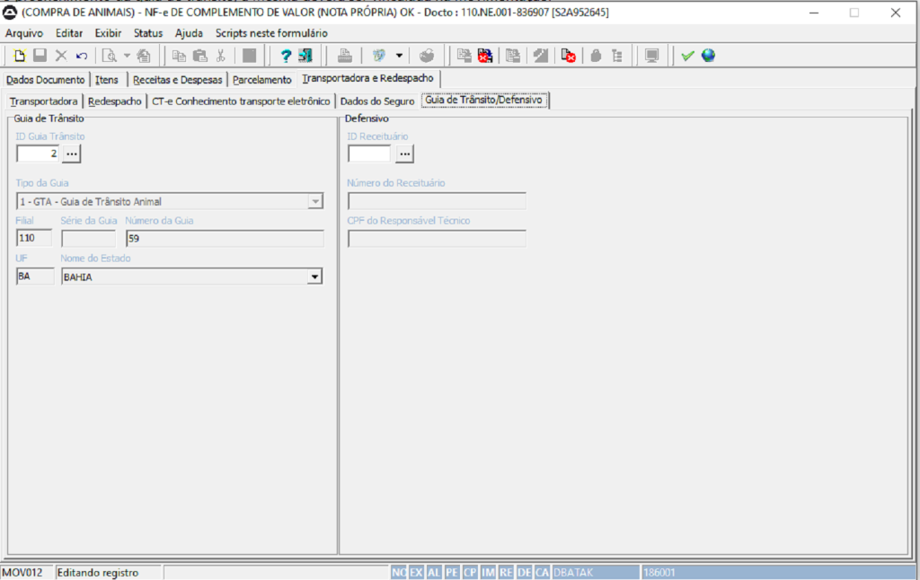 Aba: Transportadora e Redespacho > Guia de Trânsito/Defensivo