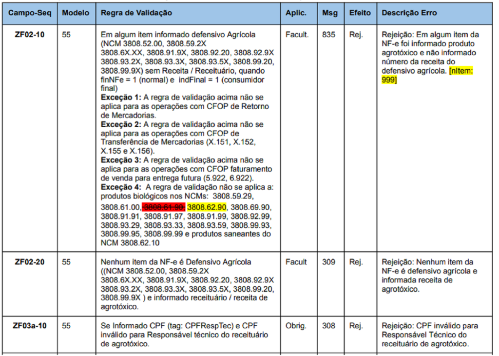 Para operações envolvendo Defensivos Agrícolas e Guia de Trânsito Vegetal, aplicam-se também regras de equivalência baseadas na classificação NCM e no CFOP. As validações aplicáveis são apresentadas a seguir: