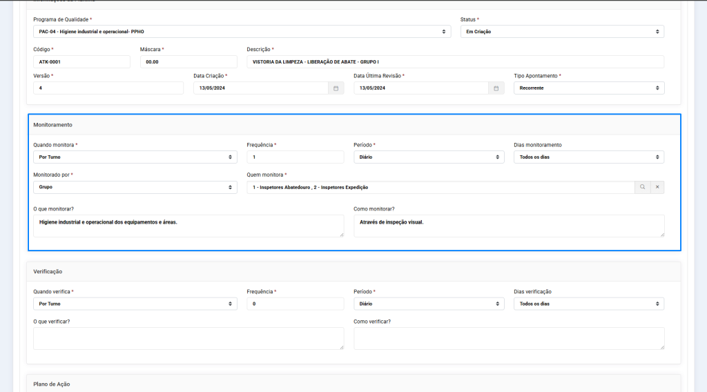 Os parâmetros de monitoramento são aplicados diretamente à planilha e impactam sua disponibilidade para registros. O campo “Quando monitora” controla a lógica de repetição (turnos ou dia). O campo “Frequência” é interpretado pelo sistema conforme o tipo da planilha (recorrente ou por demanda). O Período de Monitoramento gera janelas específicas de preenchimento.