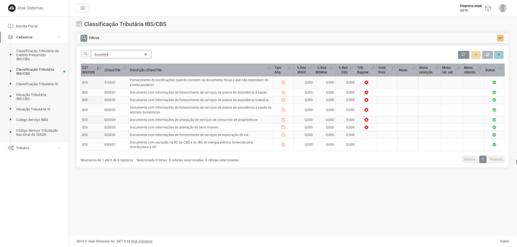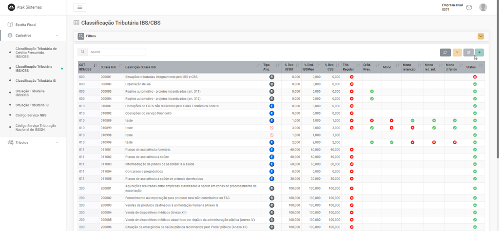 - Permite filtrar registros por CST IBS/CBS, Status e Tipo de Alíquota