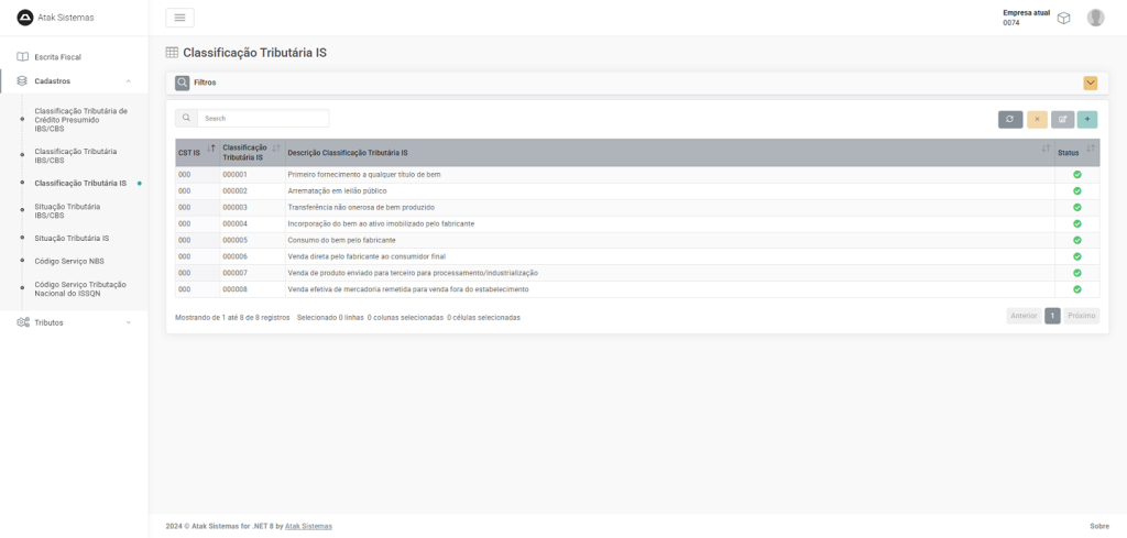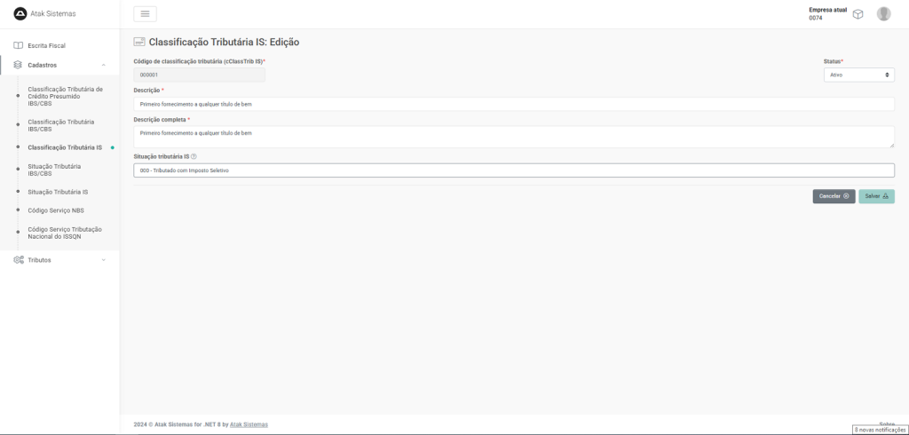 O recurso “Classificação Tributária IS” é um módulo de cadastro destinado ao registro dos códigos de classificação tributária do Imposto Seletivo (IS), conforme estabelecido pela Reforma Tributária Brasileira. Este módulo atende às especificações das seguintes documentações técnicas: NT 2025.002-RTC (NF-e/NFC-e), NT 2025.001 v1.05b (CT-e) e Nota Técnica nº 003 – Versão 1.2 (NFS-e).