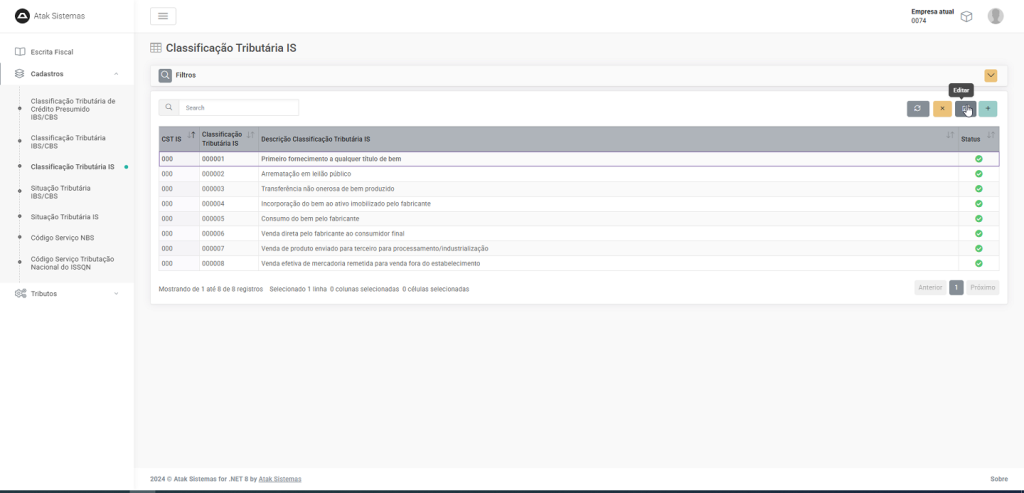 Como editar um registro na rotina de Classificação Tributárias do IS no sistema?