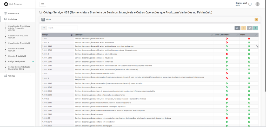 - Os códigos NBS são definidos e atualizados pela Receita Federal, porém o sistema permite a criação manual de novos códigos quando necessário, especialmente em situações onde novos códigos oficiais são criados e a tabela não é atualizada em tempo hábil pelos órgãos competentes.