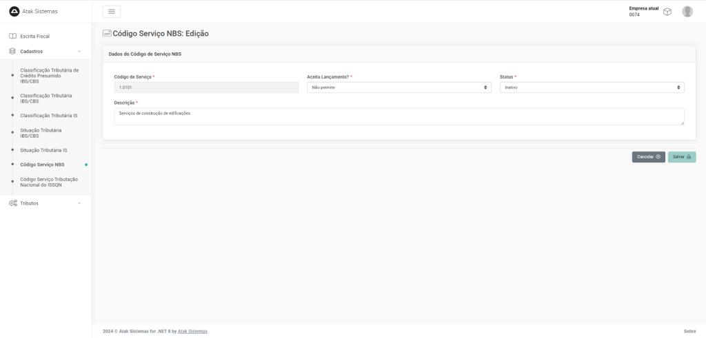 Escrita Fiscal > Cadastros > Código Serviço NBS