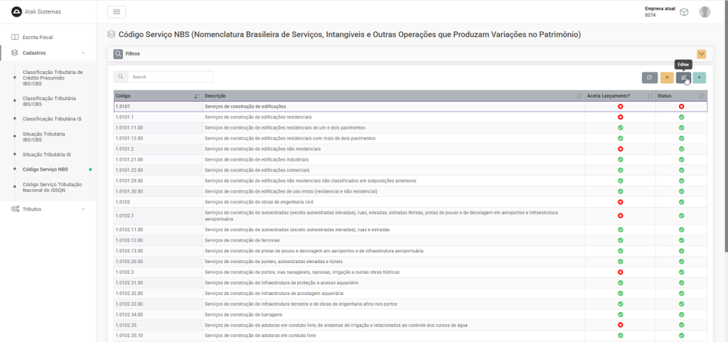 Como editar um registro na rotina de Código de Serviço NBS?