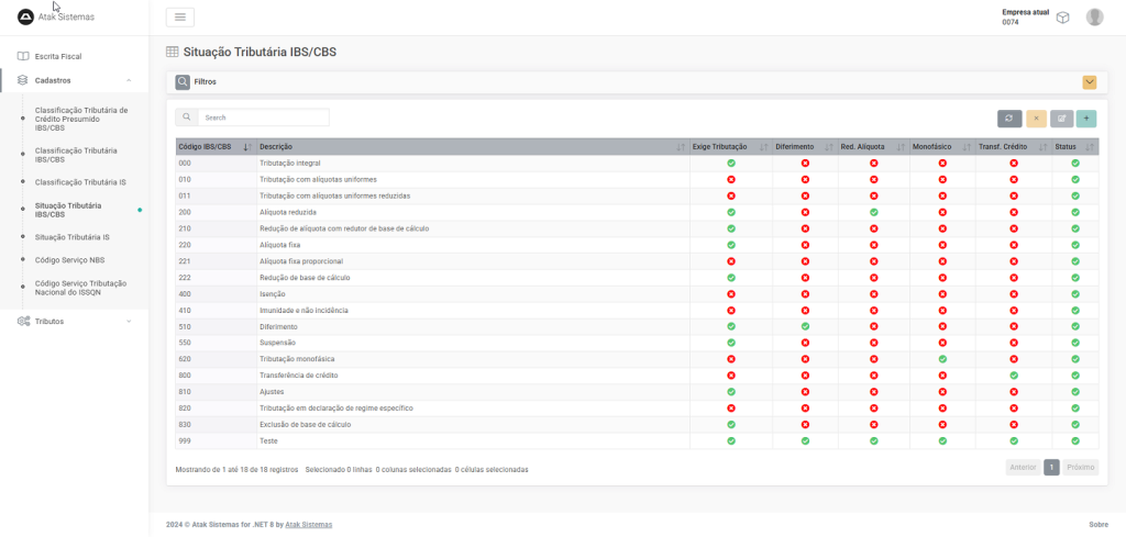 O módulo Situação Tributária IBS/CBS do sistema ERPAtak gerencia centralmente os códigos CST oficiais do governo federal, integrando classificações do Portal NFe e sistema piloto CBS (https://piloto-cbs.tributos.gov.br/servico/calculadora-consumo/calculadora) para o Imposto sobre Bens e Serviços (IBS) e Contribuição sobre Bens e Serviços (CBS) conforme definições da Receita Federal.