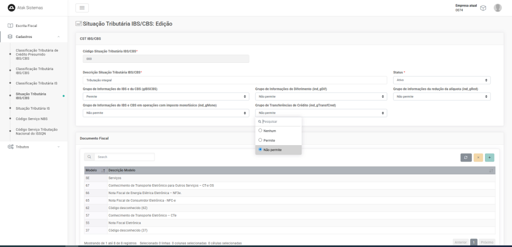Funcionando como tabela de referência mestra, o módulo armazena códigos CST oficiais e define grupos de informações tributárias obrigatórias para cada situação, garantindo padronização e conformidade total com as especificações da reforma tributária brasileira.
