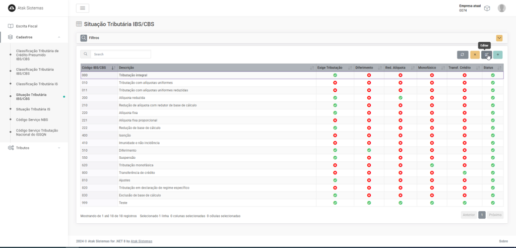 Como editar um registro na rotina de Situação Tributária de IBS/CBS no sistema?