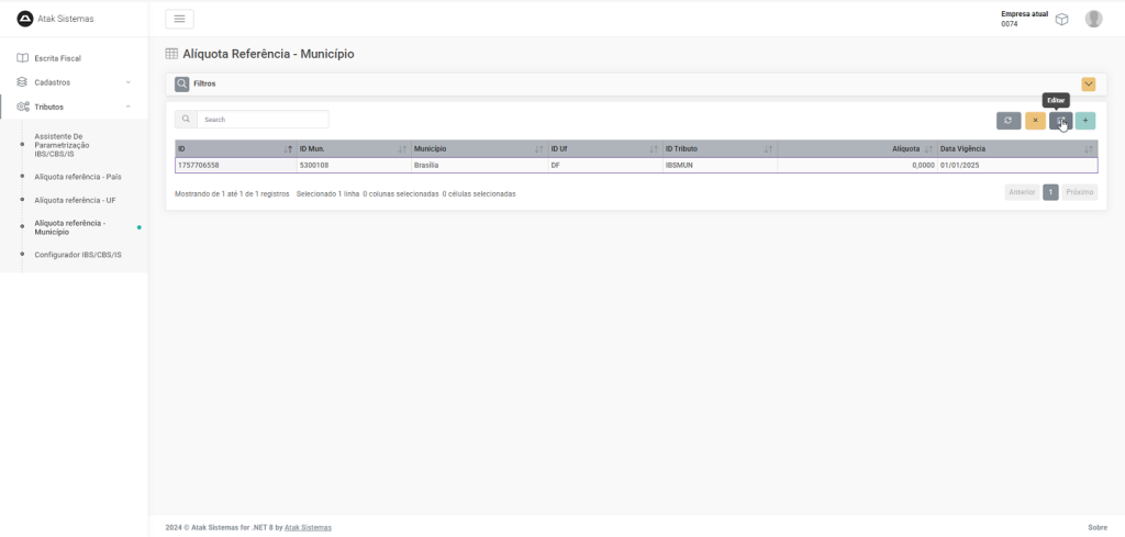 Para editar uma alíquota municipal, o usuário seleciona o registro na grade e utiliza o botão “Editar”, ou executa um duplo clique na linha correspondente.