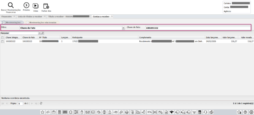 O sistema exibirá as movimentações relacionadas à chave-fato informada.
