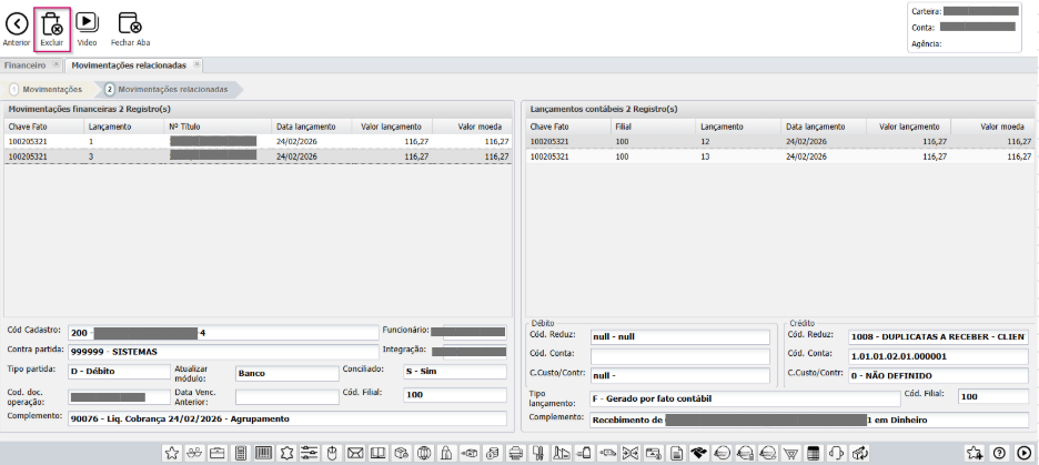 - Ao excluir a liquidação, todos os títulos vinculados à mesma chave-fato serão afetados.