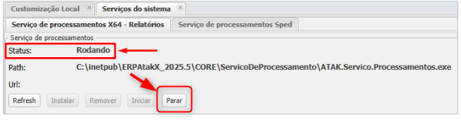 Se o Serviço de processamentos de relatórios já estiver com o status Rodando, mas o erro persistir, será necessário reiniciá-lo.