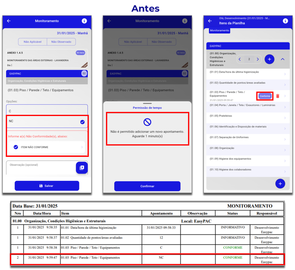 - Assim, o usuário precisará lançar um novo registro, garantindo que o status será sempre “Conforme” ou “Não Conforme”.