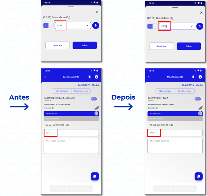 • Foi identificado que, ao inserir valores em campos decimais, o sistema realizava arredondamento automático. Em alguns casos, isso alterava a forma de exibição do valor digitado (ex: 0,039 → 0,040), podendo impactar a percepção de precisão dos dados.​