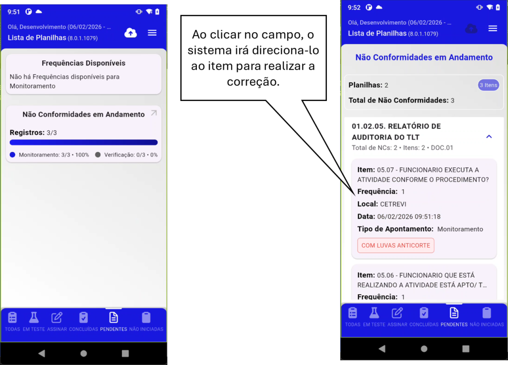 - Ao clicar no indicador, o sistema direciona o usuário diretamente ao item correspondente para realizar a correção.