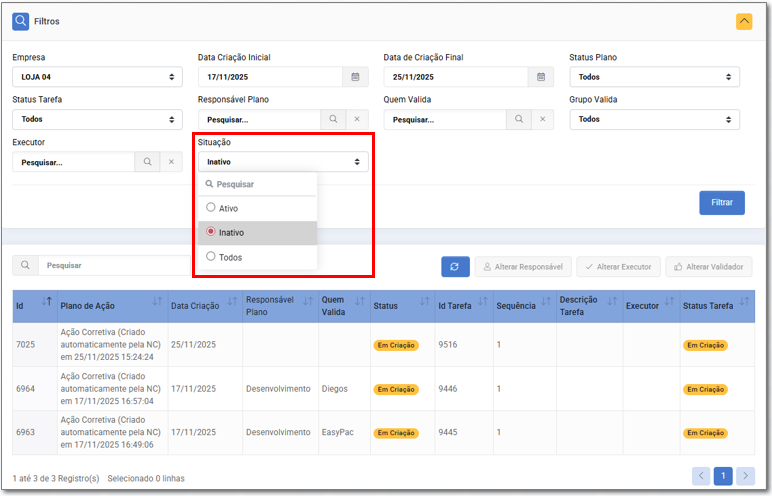 • Foi adicionado o filtro Situação (Ativo / Inativo) na manutenção de Plano de Ação. Agora é possível visualizar e gerenciar planos Inativos, incluindo a transferência de responsável quando necessário.​